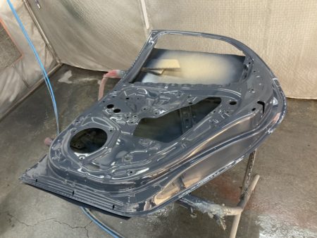 ▼サフェーサーを吹き付けたドアを組付けます。