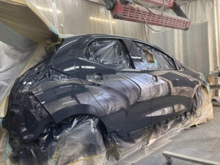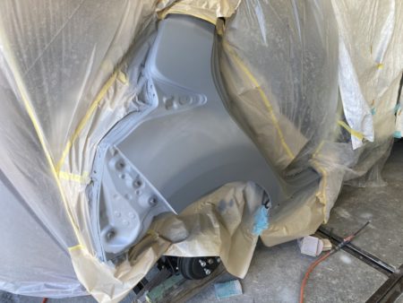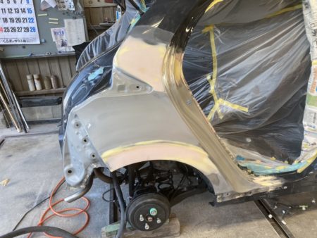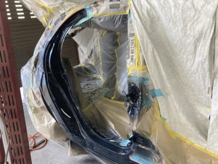 ▼次にドアを組み付けて、フロントのフェンダーからクォーターパネルにかけて塗装します。