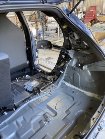 ▼クォーターパネルをカットするのでシートや内張などを取り外します。